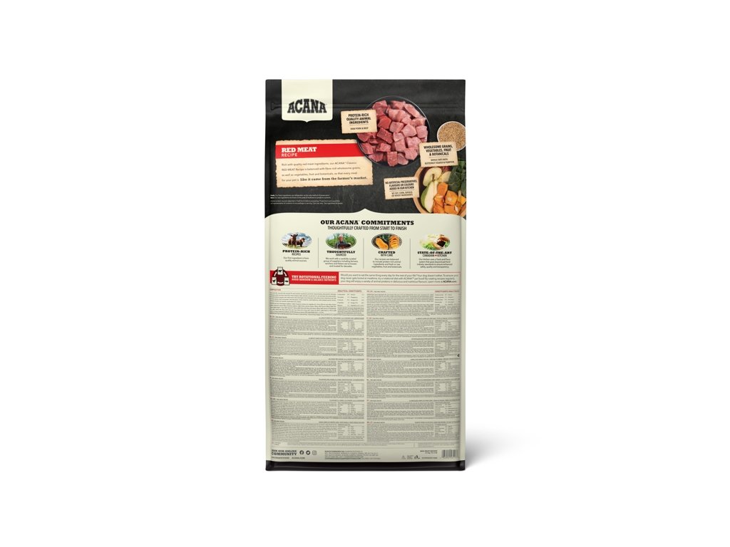 Acana Dog Classics Red je krmivo vhodné pro pejsky každého věku i plemene. Obsahuje jehněčí z volného chovu, anguské hovězí a yorkshirské vepřové. Má velmi rozmanité a bohaté složení a nízkou glykemickou zátěž (neobsahuje vysokoglykemické obiloviny). Kvalitní živočišné proteiny a Omega 3 přispívají k výborné kondici psa.