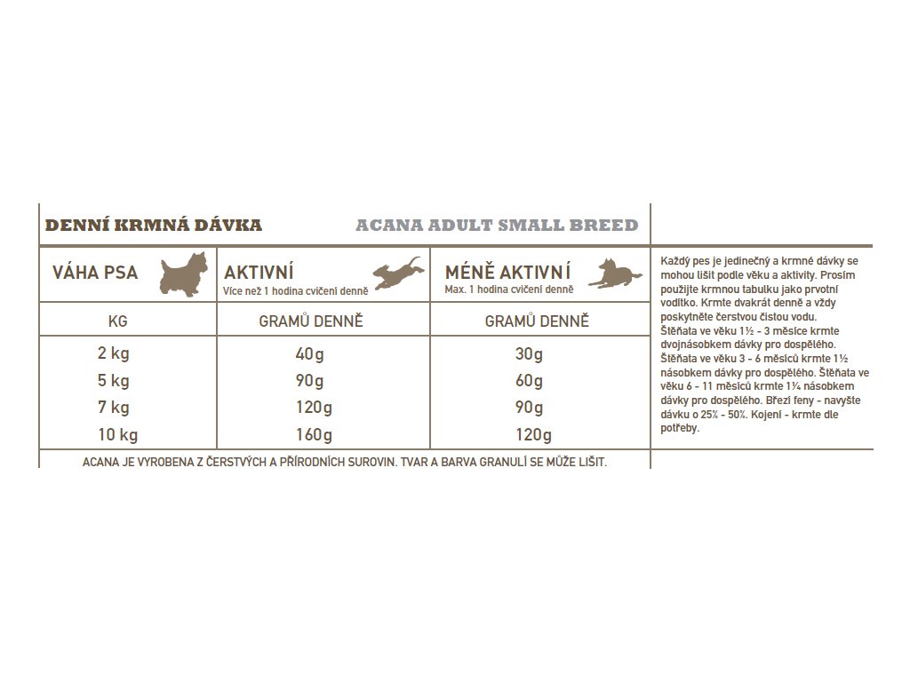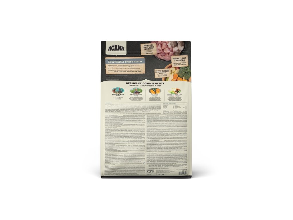 Acana Dog Recipe Adult je krmivo vhodné pro pejsky malých plemen od jednoho roku. Obsahuje kuře, krůtu, vejce a platýse. Ryby jsou volně loveny a kuřata pocházejí z volných chovů. Krmivo má velmi rozmanité a bohaté složení, které zajistí výbornou kondici psa.