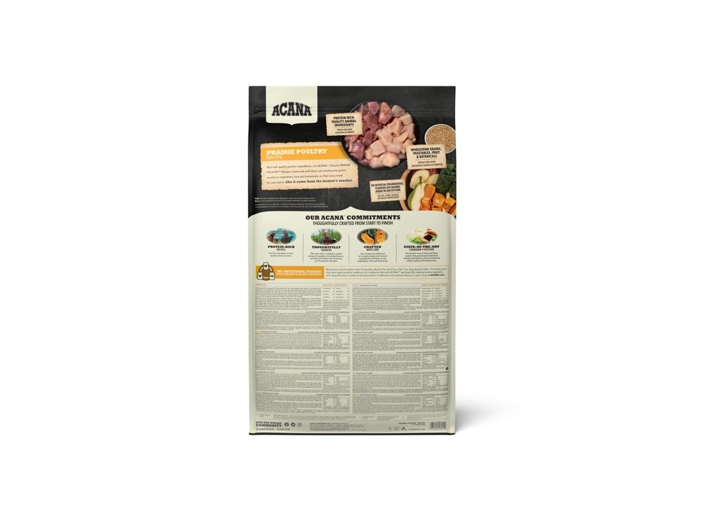Receptury ACANA® jsou vytvořeny od začátku až do konce s použitím lahodných a kvalitních surovin. Drůbež, výživné ovoce, obiloviny a zelenina v krmivu ACANA Classics Prairie Poultry poskytují vašemu psovi syté a výživné jídlo vyrobené z jednoduchých a zdravých surovin. Obsahuje také ingredience bohaté na živiny, které podporují tři klíčové zdravotní benefity, včetně imunitní funkce, zdravého trávení a zdravé kůže a srsti.