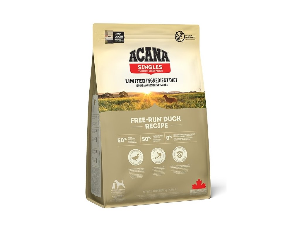 Kompletní kanadské krmivo s jediným zdrojem živočišného proteinu Acana Dog Free-run Duck Singles.