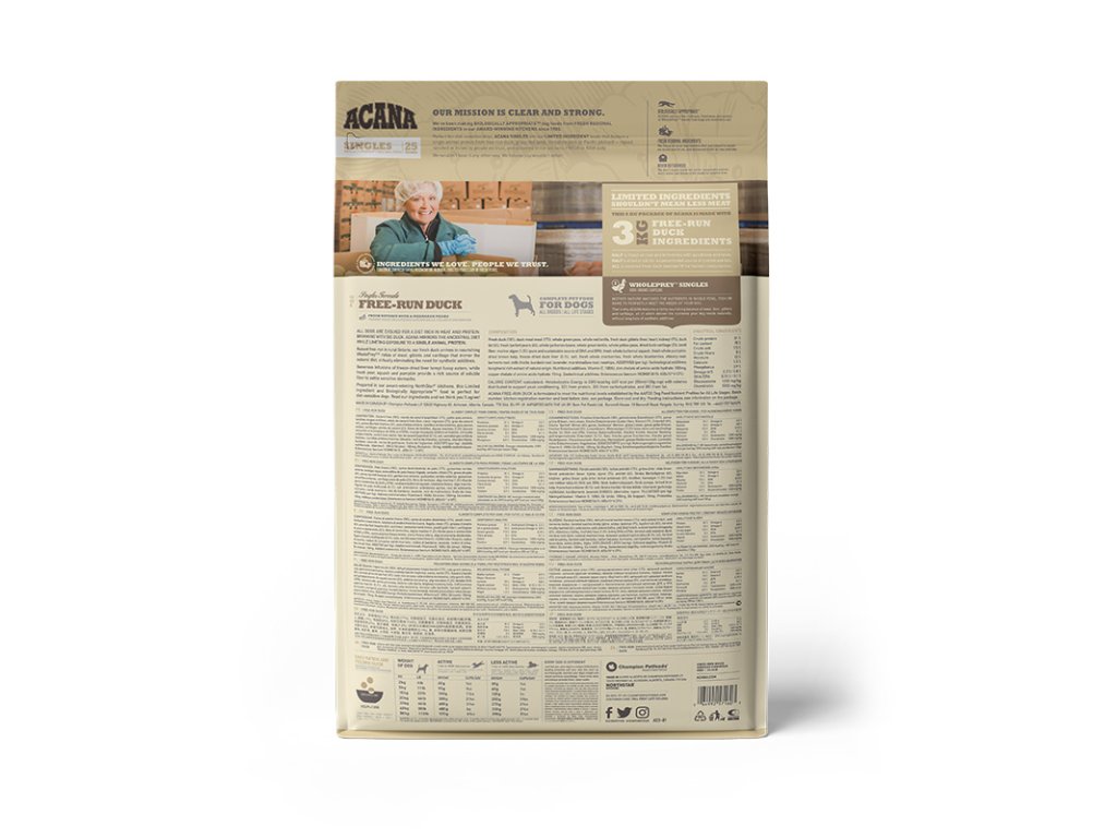 Kompletní kanadské krmivo s jediným zdrojem živočišného proteinu Acana Dog Free-run Duck Singles.