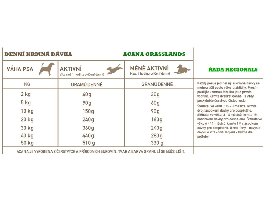 Acana Dog Recipe Grasslands je krmivo vhodné pro psy všech plemen i věku. Granule s nízkým obsahem sacharidů a vysokým obsahem proteinů. Obsahuje jehněčí a kachní maso, vejce a ryby. Zvířata pochází z volného chovu. Receptura je zcela bez obilovin.