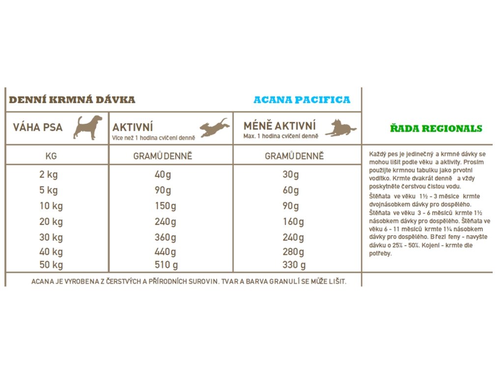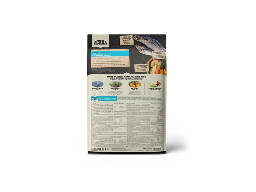 Acana Dog Recipe Pacifica je krmivo vhodné pro psy všech plemen i věku. Granule s nízkým obsahem sacharidů a vysokým obsahem proteinů. Obsahuje maso z volně lovených ryb jako je sleď, sardinka, platýs, hejk a okouník. Receptura je zcela bez obilovin.