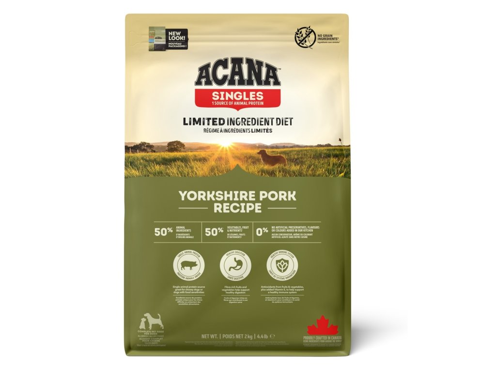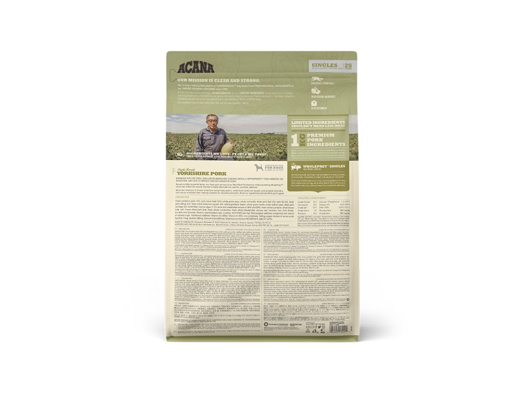 KOMPLETNÍ KRMIVO PRO PSY VŠECH PLEMEN A VŠECH VĚKOVÝCH KATEGORIÍKRMIVO S JEDINÝM ZDROJEM ŽIVOCIŠNÉHO PROTEINU ACANA YORKSHIRE PORK OBSAHUJE 50% YORKSHIRSKÉHO VEPŘOVÉHO, KTERÉ JE NÁM DODÁVANÉ ČERSTVÉ V PODÍLU CELÉ KOŘISTI. DÍKY VÝTAŽKU Z MRAZEM SUŠENÝCH JATER CHUTNÁ I VYBÍRAVÝM JEDLÍKŮM. ČERSTVÉ DÝNĚ A MÁSLOVÉ DÝNĚ POSKYTUJÍ ROZPUSTNOU VLÁKNINU, COŽ PROSPÍVÁ PSŮM S CITLIVÝM ZAŽÍVÁNÍM.SLOŽENÍ: syrové vepřové (18 %), celé dehydrované vepřové (18 %), celý zelený hrách, celá červená čočka, syrová vepřová játra (8%), vepřový tuk (6%), čerstvá celá máslová dýně (4%), celá cizrna, celá zelená čočka, celý žlutý hrách, vláknina z čočky, hrachový škrob, řasa (zdroj DHA a EPA), čerstvá celá dýně, sušená řasa, sůl, čerstvé celé brusinky, čerstvé celé borůvky, sušený kořen čekanky, kurkuma, ostropestřec, kořen lopuchu, levandule, kořen proskurníku, šípky.DOPLŇKOVÉ LÁTKY (na kg): Technologické doplňky: 1b306(i) extrakt tokoferolu z rostlinných olejů: 110 mg. 1a330 kyselina citrónová: 40 mg, smyslové doplňky: extrakt z rozmarýnu:75 mg, výživové doplňky: 3a370 taurin: 1 500 mg. 3a890 cholin chlorid (cholin): 1 050 mg, 3b612 (zinek: 160 mg, 3b407 (měď: 5,5 mg), 3a821 vitamín B1: 100 mg, 3a825i vitamín B2: 20 mg, 3a314 niacin: 200 mg, 3a841 D-pantothenát vápenaty: 60 mg, 3a831 vitamin B6: 35 mg, 3a316 kyselina listová: 7 mg, 3a835 vatamín B12: 0,2 mg, 3a671 vitamín D3: 1000 IU, 3a700 vitamín E: 500 IU.ZOOTECHNICKÉ DOPLŇKY: 4b1707 Enterococcus faecium DSM 10663 NCIMB 10415: 1x10^9 CFU.ANALYTICKÉ SLOŽKY: Hrubý protein 31 %, Obsah tuku 15 %, Hrubý popel 7,5 %, Hrubá vláknina 5 %, Vlhkost 12 %, Vápník 1,2 %, Fosfor 0,9 %, Omega-6 2,6 %, Omega-3 0,9 %, DHA / EPA 0,15 % / 0,1 %.Obsah kalorií (vypočítaný): Vstřebatelná energie je 3393 kcal/kg (407 kcal na odměrku 120g).