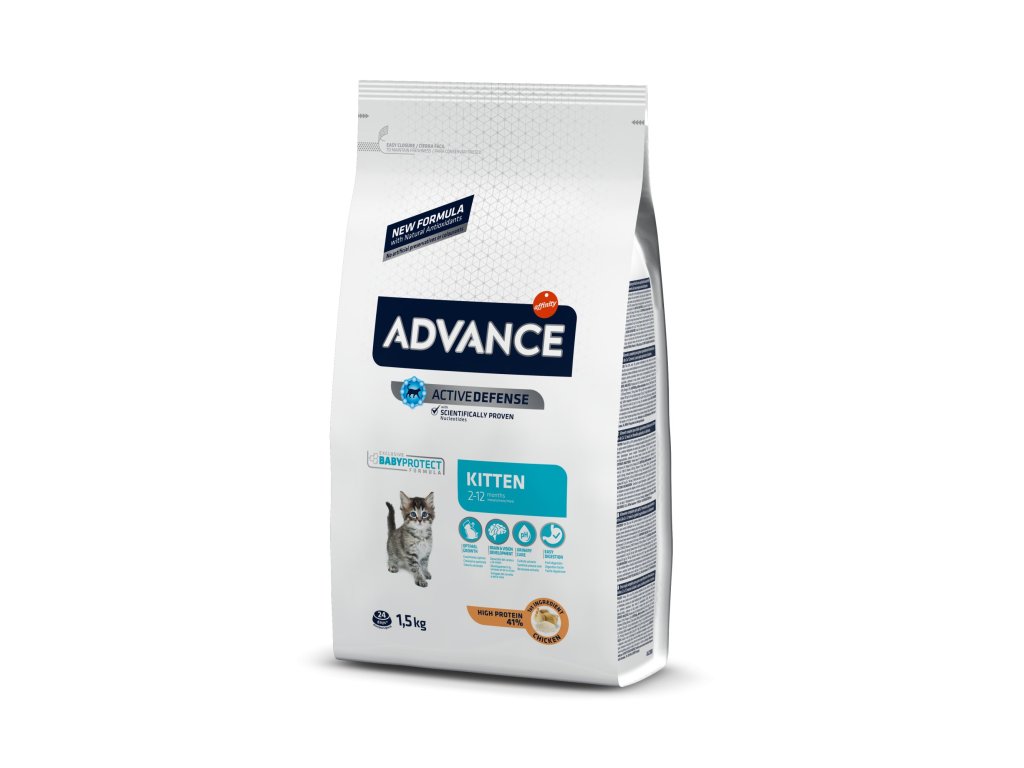 Speciální kompletní krmivo Advance Cat Kitten je navržené pro koťata od 2 do 12 měsíců a také pro kojící nebo březí kočky. Svým složením s vysokým obsahem živin, vitaminů, bílkovin a minerálních látek zajišťuje zdravý vývoj a růst a doplňuje potřebnou energii. Dále granule obsahují omega-3 a omega-6 mastné kyseliny pro silné a zdravé srdce, zrak, průchodnost a vývoj cévního ústrojí a také snižují riziko zánětlivých a kožních onemocnění. Pomáhají regulovat kyselost pH v moči a zajišťují správný chod střev a celkové zažívací pohody v bříšku vaší kočky. Granule Advance Cat Kitten jsou skvělou volbou, pokud chcete své kočce dopřát vyvážené krmení.