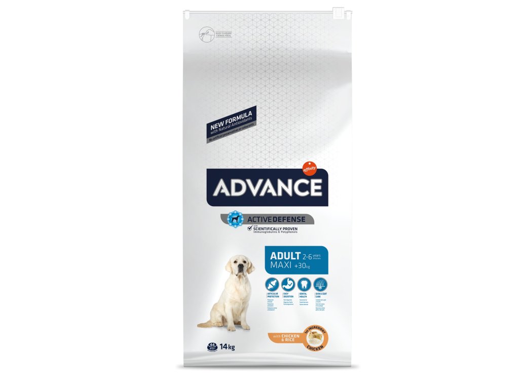 Superprémiové suché krmivo ADVANCE Dog pro dospělé psy velkých plemen. Bílkovinovou složkou je kuřecí maso. Kloubní ochrana s CHONDROITINEM a GLUKOSAMINEM napomáhá ke správné funkčnosti a zdraví kloubů. Lehce stravitelné kuře s rýží jako chutná kombinace vhodná pro mlsné mazlíčky. Granule s obsahem pyrofosfátů napomáhají čištění zubního plaku a přispívají tím i ke zdravějším dásním. Omega 3 a 6 mastné kyseliny napomáhají k lesklé a zdravé srsti a kůži.
