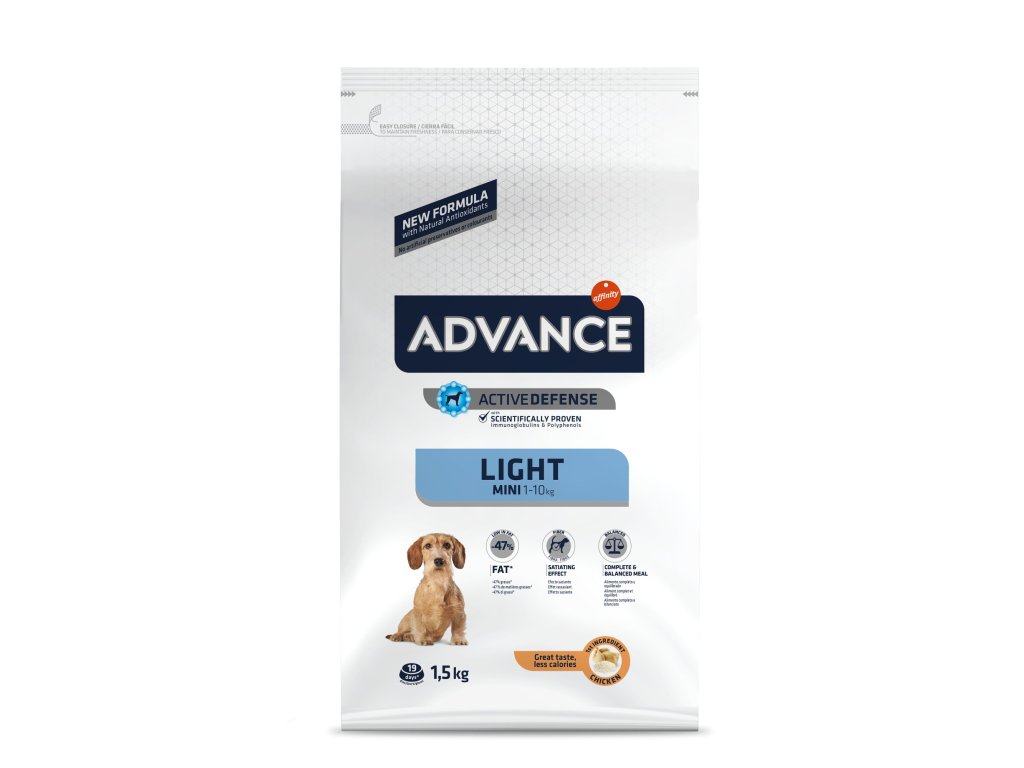 Advance Dog Mini Light je kompletní a vyvážené krmivo určené pro dospělé psy malých plemen. Granule mají nízké množství tuku a zároveň vysoký obsah vlákniny, která pomáhá zajistit pocit sytosti. Už se tak nemusíte bát, že váš malý pes bude nekontrolovatelně přibírat na váze. Nová receptura kompletního krmiva s nízkým obsahem tuků a vysokým obsahem bílkovin pomáhá vašemu psovi kontrolovat svou hmotnost bez ztráty svalové hmoty.