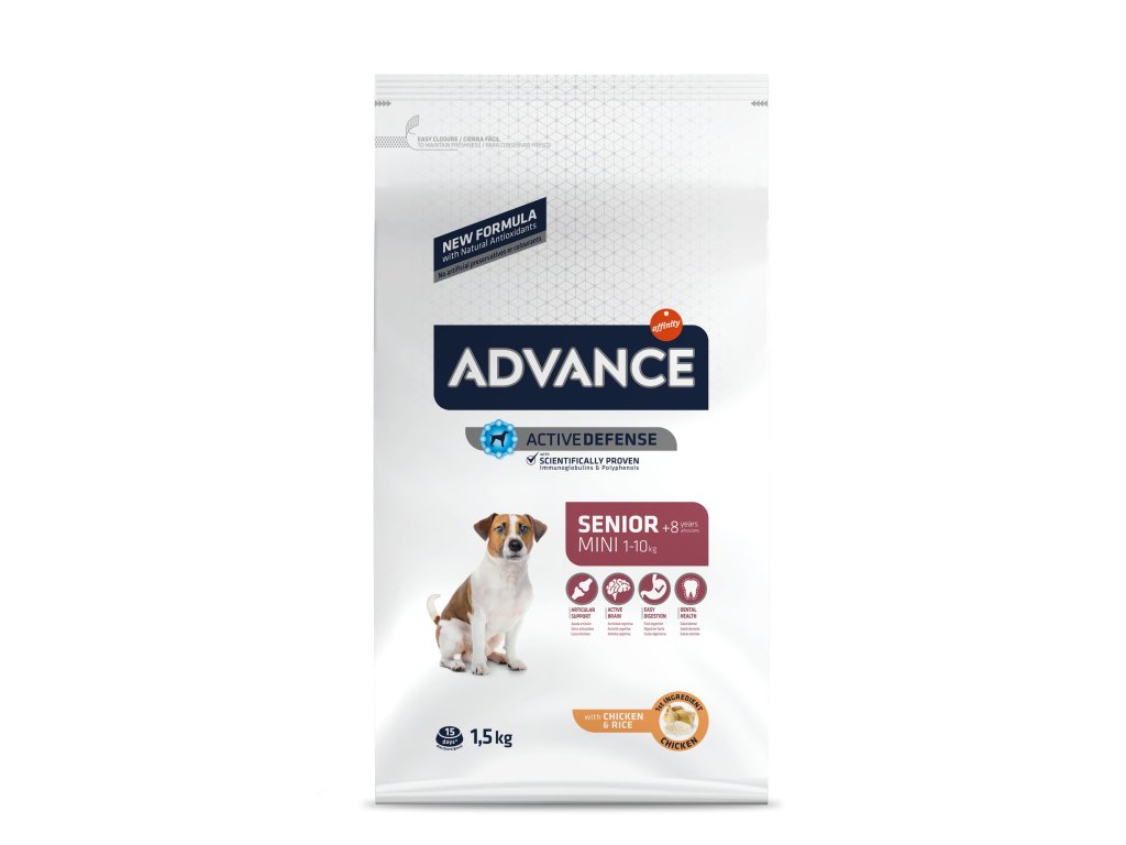 Pro psího seniora jen to nejlepší. Starý pes potřebuje o mnoho větší péči o klouby, srdce, oči, sluch či srst. Senior Mini je špičkové, snadno stravitelné krmivo, které splňuje specifické potřeby staršího psa tím, že posiluje jeho přirozené bariéry a obranyschopnost. Starší psi ve věku od 8 let potřebují stravu, která je speciálně přizpůsobena jejich nutričním potřebám. Díky exkluzivní receptuře Advance pomáhá chránit kloubní chrupavku, svalovou hmotu, zdraví střev, zdraví zubů a kognitivní aktivity u starších psů. ADVANCE Senior Mini navíc obsahuje taurin, který přispívá k dobré funkci srdce.