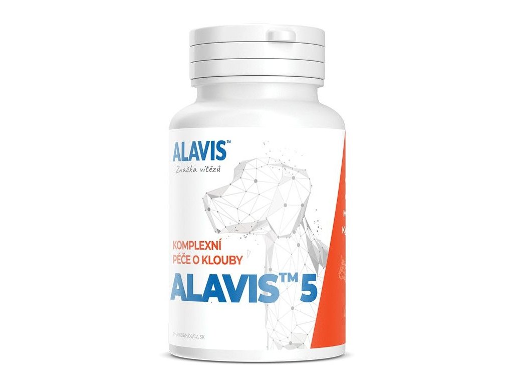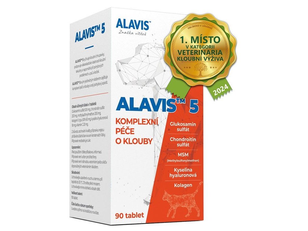 Kloubní veterinární přípravek pro psy a kočky. ALAVIS™ 5 vyživuje kloubní chrupavky, podporuje promazávací vlastnosti kloubní tekutiny a pomáhá při pohybových problémech. ALAVIS™ 5 obsahuje kombinaci látky MSM a chondroprotektivních látek – glukosamin sulfátu, chondroitin sulfátu, kyseliny hyaluronové a kolagenu.