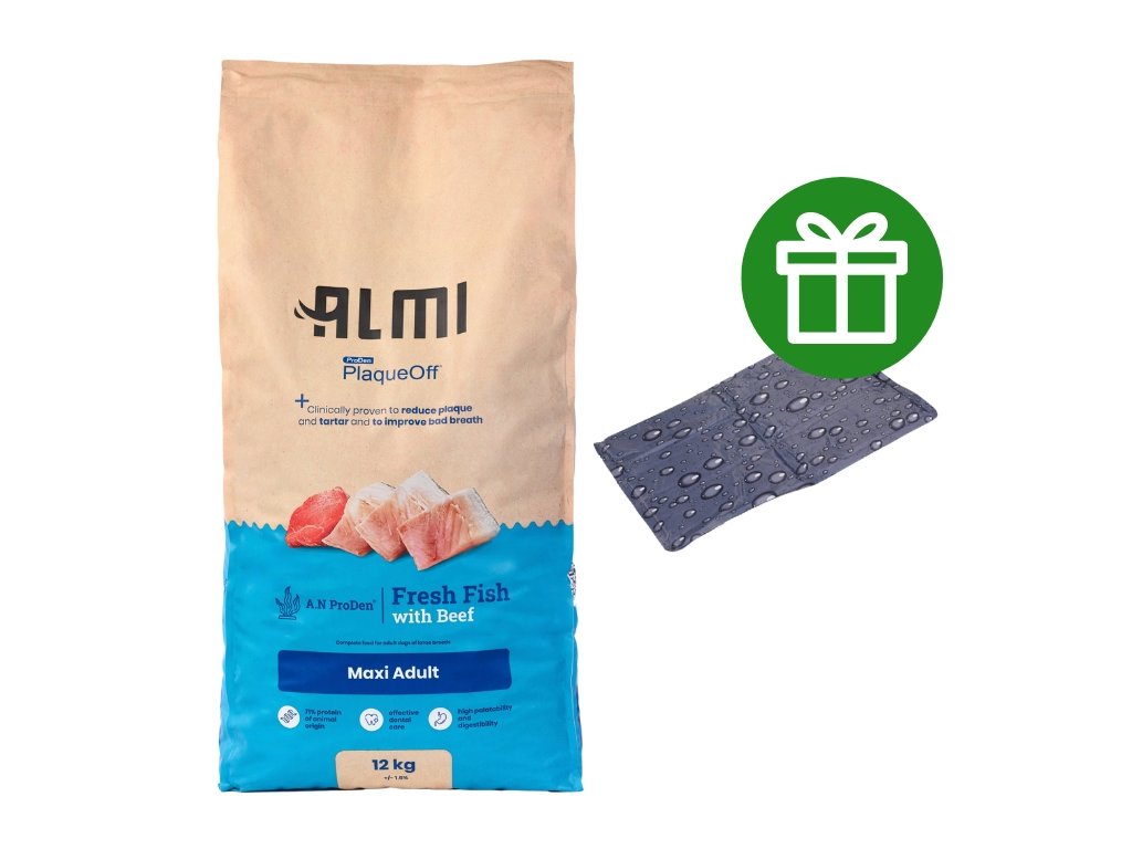 Granule ALMI Maxi Adult nabízí komplexní výživu díky vyváženému složení s 71 % živočišného proteinu. Obsahují čerstvé rybí maso ze sledě a hovězí maso, doplněné o hrách, jablka a řepnou vlákninu. Neobsahují žádná přidaná umělá barviva a jsou přirozeně konzervovány rozmarýnovým extraktem. Rýže pak zajišťuje dobrou stravitelnost krmiva. Granule ALMI jsou obohacené o PlaqueOff™, u kterého je klinicky prokázáno, že snižuje zubní plak, zubní kámen a zlepšuje špatný dech.