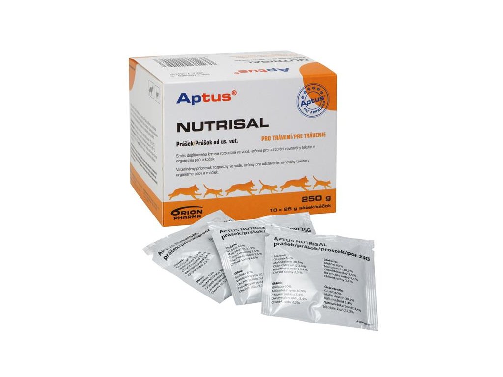 Nutrisal prášek je používán pro obnovení normálního stavu hydratace a nedostatku elektrolytů u psů a koček, např. ve spojení s onemocněními střev. Jestliže pes nebo kočka trpí průjmem, ztrácí velká množství tekutin, a u zvířete může nastat dehydratace. V tomto případě potřebuje zvíře dodávat k pitné vodě také elektrolyty, které jsou obsaženy v optimálních množstvích v přípravku Nutrisal. V souvislosti s průjmovými onemocněními doporučujeme podávat psům a kočkám také Aptus Attapectin tablety, které váží produkty střevní fermentace. Navíc lze nahrazovat tekutiny podáváním elektrolytového roztoku Nutrisalu po těžké zátěži nebo během cestování autem v horkém počasí.
