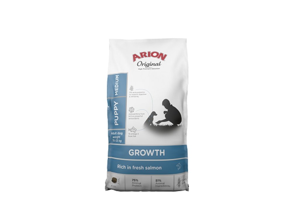 Arion Original Growth Puppy Fish Medium je kompletní krmivo pro štěňata středně velkých plemen. Bezlepková receptura na bázi ryb obsahuje unikátní kombinaci mořských surovin, prebiotika a probiotika a potřebné množství vitaminů a minerálních látek pro zajištění správného růstu vašeho psa.Složení: Ryby 36 % (z toho 14 % čerstvý losos a 22 % sušený protein z mořských ryb), rýže, kukuřice, hrášek, živočišný tuk, hydrolyzovaná živočišná bílkovina, minerální látky, pivovarské kvasnice, řepné řízky, antarktický kril, rybí tuk, psyllium, ß-glukany, F.O.S., G.O.S., M.O.S., sušené bylinky (Rosmarinus sp., Curcuma sp., Eugenia sp.).Analytické složení: hrubý protein 27 %, hrubý tuk 18 %, hrubá vláknina 2 %, hrubý popel 7,5 %, vápník1,4 %, fosfor 1 %, omega-3: 1,25 %.Výživové doplňky: Vitamín A (I.U./kg) 3a672a: 22000, Vitamin D3 (I.U./kg) 3a671: 1850, Vitamin C (mg/kg) 3a312: 300, železo (mg/kg) 3b103: 109, měď (mg/kg) 3b413: 10, zinek (mg) 3b507: 127, mangan (mg/kg) 3b506: 7,3, jód (mg/kg) 3b202: 2,5, selen (mg/kg) 3b815: 0,2.Zootechnické a technologické doplňky: Obsahuje přírodní antioxidanty (výtažky tokoferolu z rostlinného oleje), konzervační látky, Bacillus velezensis 1 x 10_ CFU/kg.Vstřebatelná energie: 3956 kcal/kg.Dávkování: Doporučenou denní dávku pro vašeho psa/kočku naleznete v tabulce na obalu produktu. Tato tabulka je orientační a závisí na aktivitě vašeho psa/kočky. K pití vždy poskytněte misku s čerstvou vodou. Skladujte na chladném a suchém místě. Pro zachování kvality produktu doporučujeme uchovávat obal uzavřený.váha v dospělostit (kg) / g/denně______2 měs__4 měs__6 měs__8 měs__10 měs__12 měs__14 měs10 kg____________________________125____160____175____175____175____170____dospělí15 kg____________________________145____220____235____240____235____230____dospělí20 kg____________________________175____265____295____295____290____285____dospělí25 kg____________________________190____315____350____350____245____335____dospělí