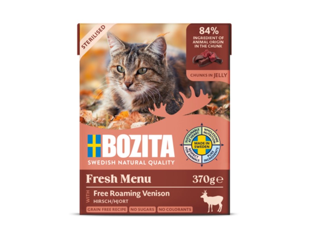Bozita Cat Sterilised chutné kompletní mokré krmivo přizpůsobené pro sterilizované kočky. Připravené z vysoce kvalitních surovin a 84 % složek živočišného původu v kouscích.