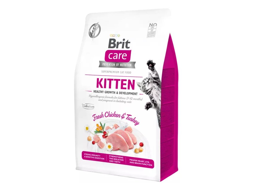 Brit Care Cat Grain-Free Kitten Healthy Growth & Development je kompletní krmivo pro koťata a březí nebo kojící kočky. Tato hypoalergenní receptura obsahuje čerstvé kuřecí a krůtí maso.