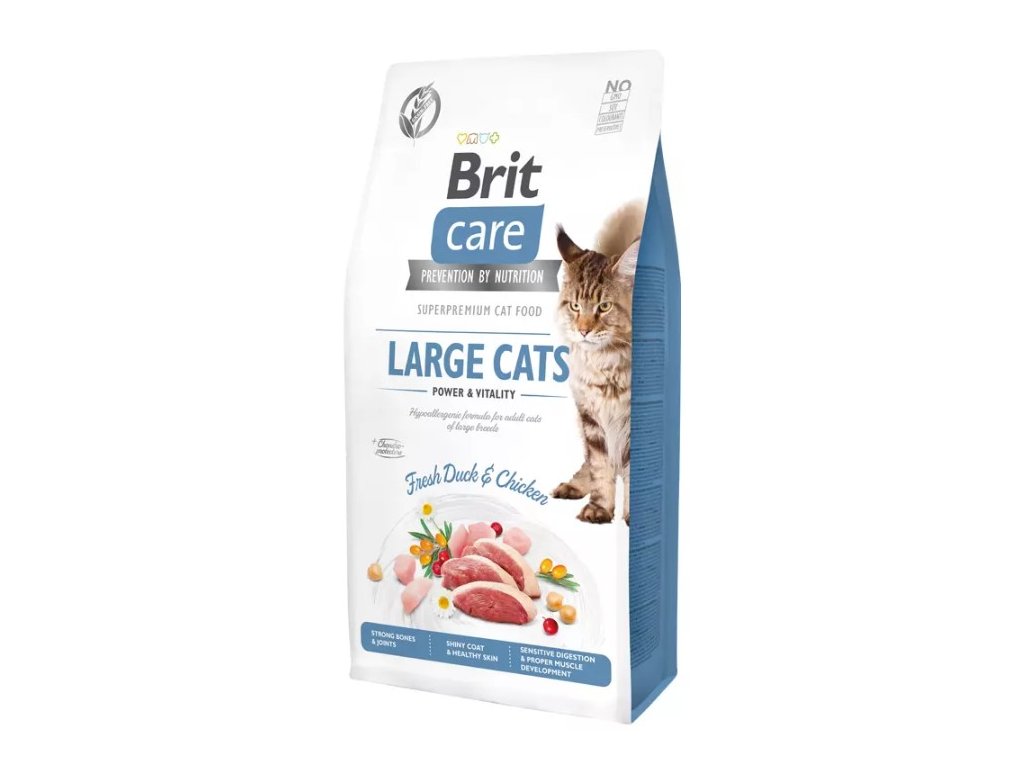 Brit Care Cat Grain-Free Large cats Power & Vitality je kompletní krmivo pro dospělé kočky velkých plemen. Hypoalergenní receptura obsahuje čerstvé kachní a kuřecí maso.