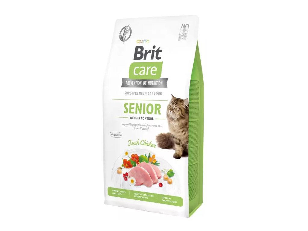 Brit Care Cat Grain-Free Senior Weight Control je kompletní krmivo pro kočky starší 7 let. Hypoalergenní receptura obsahuje čerstvé kuřecí maso. Granule jsou velmi chutné - vhodné i pro vybíravější jedince. Benefity krmiva: