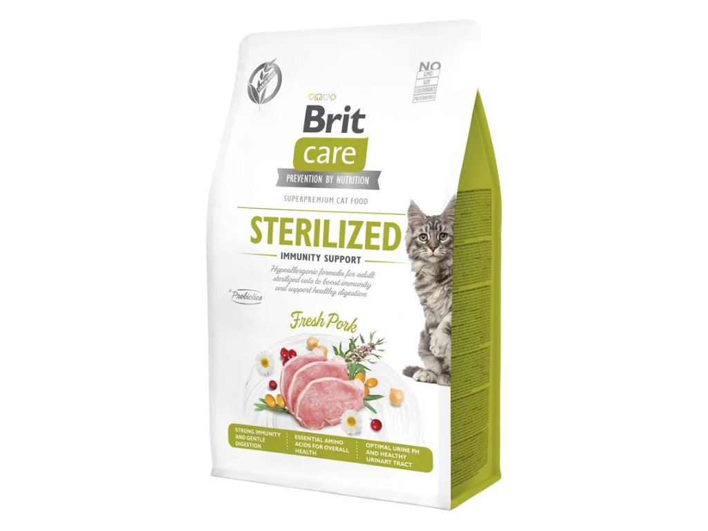 Kompletní krmivo Brit Care Cat Grain-Free Sterilized s hypoalergenní recepturou a čerstvým vepřovým masem je určené pro dospělé kastrované kočky. Bohatým a hlavním zdrojem zdravých bílkovin je čerstvé vepřové maso, které je ideální pro kočičky s citlivostí na určité potraviny a alergií na jiné běžné zdroje bílkovin. Vepřové maso je lehce stravitelné a vhodné i pro kočky, které mívají potíže s měkkou stolicí či zácpou. Krmivo je bohaté na bílkoviny a probiotika pro šetrné zažívání a silnou imunitu. Rakytník, pampeliška a nízký obsah hořčíku a L-methioninu přispívají ke zdraví ledvin a močového ústrojí a předcházejí tvorbě struvitových a oxalátových kamenů. Bez obilovin, bez přidaných barviv a konzervantů, bez GMO surovin a bez sóji.