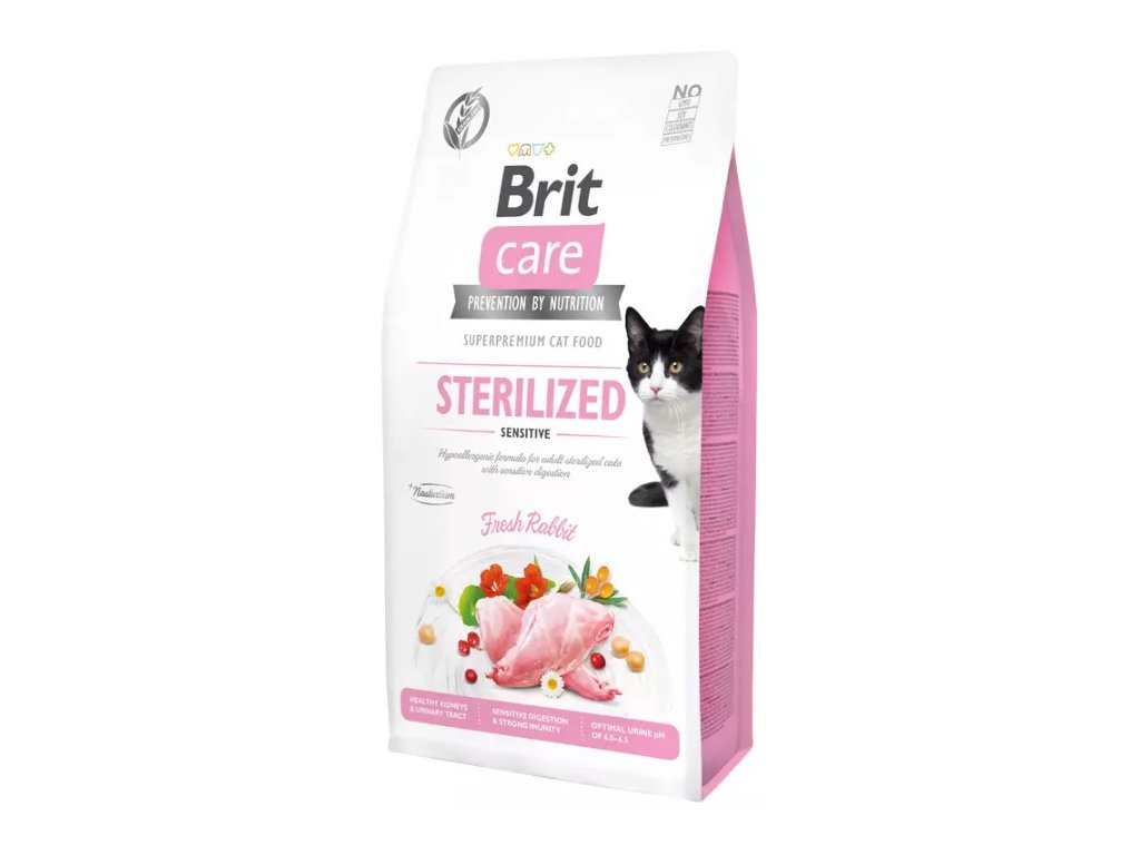 Brit Care Cat Grain-Free Sterilized Sensitive je kompletní krmivo pro kastrované kočky s citlivým zažíváním. Hypoalergenní receptura obsahuje čerstvé králičí maso. Benefity krmiva: