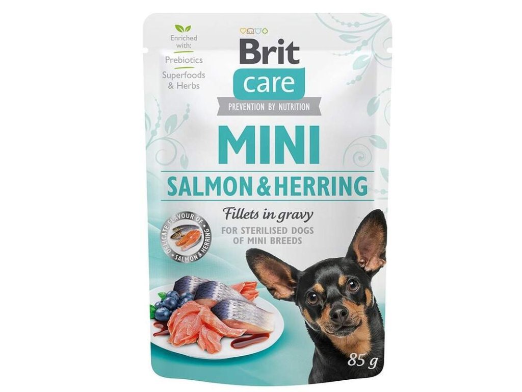 Kousky masových filetek Brit Care Mini jsou doplněny o delikátní šťávu. Kapsičky jsou ideálním doplňkem pro zpestření stravy ke granulím (vylepšení jídelníčku). Receptury MINI jsou určeny speciálně pro vybíravé jazýčky pejsků malých a trpasličích plemen. Kompletní superprémiové krmivo s označením Salmon & Herring obsahuje dva druhy rybího masa a je skvělým krmivem pro dospělé psy. Kapsičky pro psy Brit Care chutí každému.