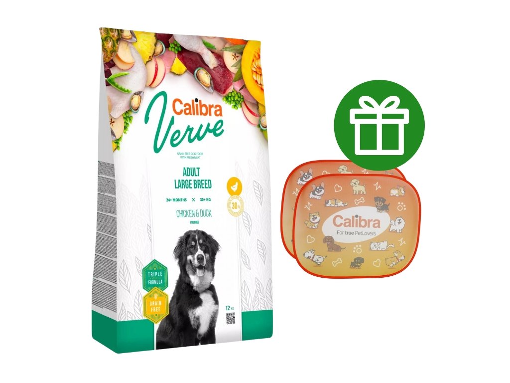 Calibra Dog Verve Adult Large Breed (Chicken & Duck) je kompletní suché krmivo s čerstvým masem a bez obilovin. Receptura je určena pro dospělé psy velkých plemen s hmotností nad 30 kg.30 % čerstvého kuřecího masa a kvalitní kachní protein zaručují psovi optimální dávku zdravé výživy. Krmivo odpovídá nejvyšším požadavkům na přirozené stravování psa v souladu s jeho fyziologickými potřebami.