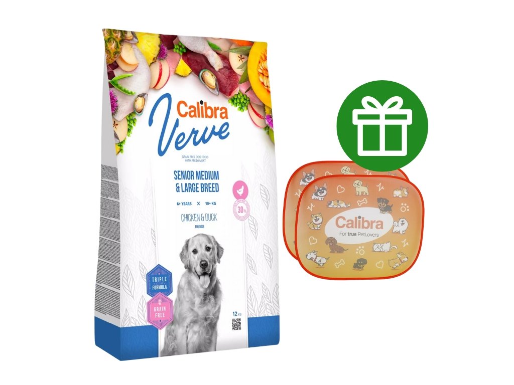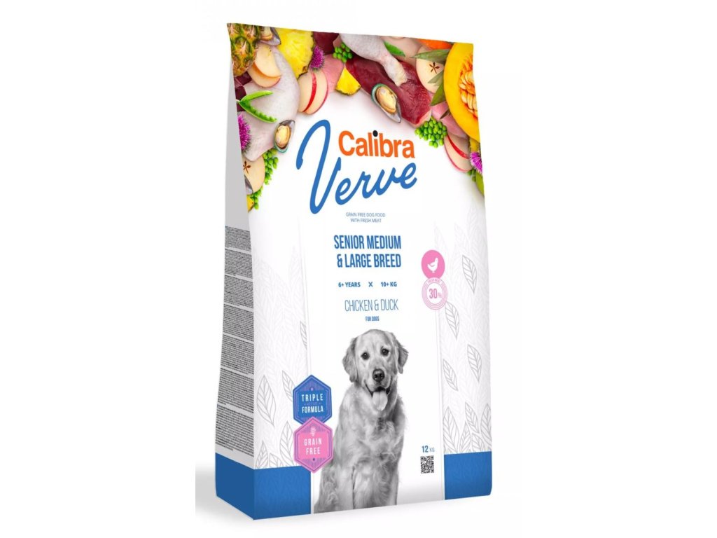 Calibra Dog Verve Senior Medium & Large Breed (Chicken & Duck) je kompletní suché krmivo s čerstvým masem a bez obilovin. Receptura je určená pro dospělé psy nad 6 let středních a velkých plemen o hmotnosti 10–90 kg. S obsahem 30 % čerstvého kuřecího masa v kombinaci s luxusním kachním proteinem je krmivo, které odpovídá nejvyšším požadavkům na přirozené stravování psa, v souladu s jeho fyziologickými potřebami. Adekvátní výživa pro zralého psa je doplněna o zvýšené množství chondroprotektivních látek pro namáhané klouby větších pejsků.
