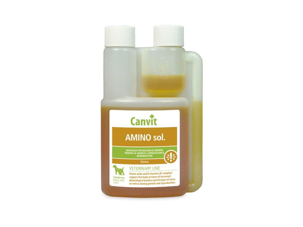 Canvit Amino sol. je komplex hydrofilních vitamínů skupiny B, aminokyselin, glukózy a solí ve formě tekutého roztoku. Tyto látky podporují organizmus při zvýšené fyziologické zátěži, v období růstu, rekonvalescence, reprodukce a stresu všeho druhu (teplotního, nutričního, transportního atd.). Je vhodný pro psy a kočky k okamžité aplikaci po namáhavém sportovním výkonu a práci v zátěži, k regeneraci organismu po onemocnění a obecně při snížení příjmu krmiva.