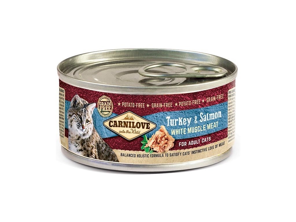 Carnilove Cat konzerva Mus Meat Turkey & Salmon je kompletní superprémiové vlhké krmení pro dospělé kočky. Receptura z masa z krocana, lososa a lahodného vývaru si zamiluje i ten největší kočičí mlsoun. Lososový olej zajistí Vaší kočce zdravou srst a kůži. Díky brusinkám bude mít zdravé močové cesty. Konzerva obsahuje pouze trhané maso z krocana a lahodný vývar.
