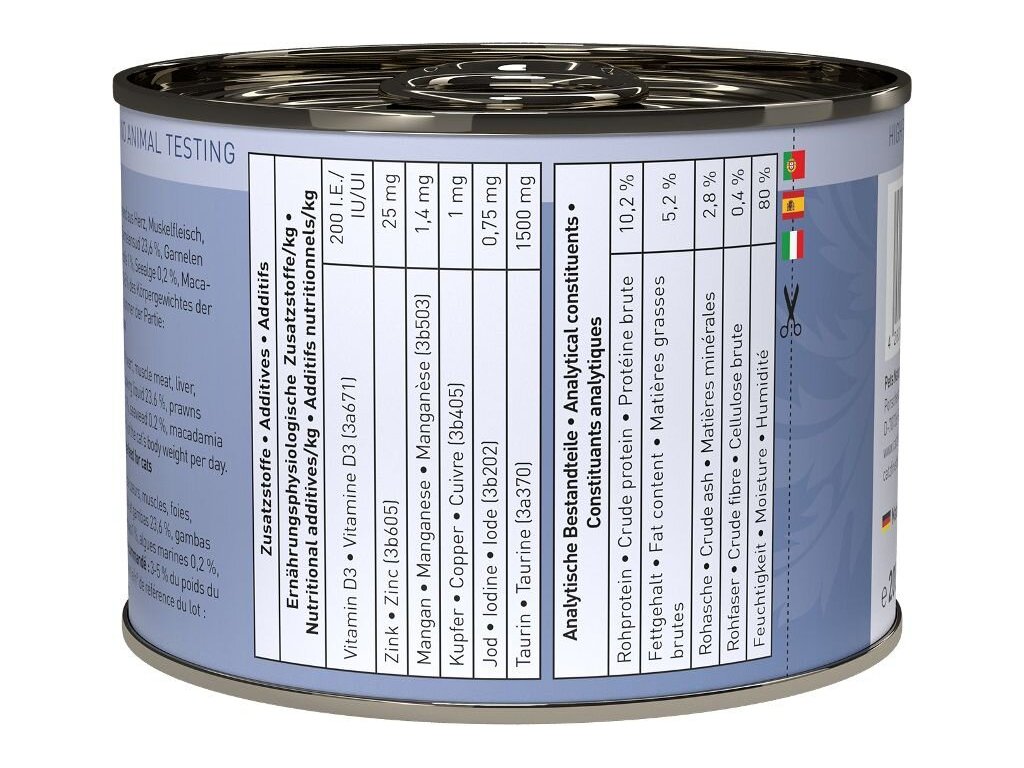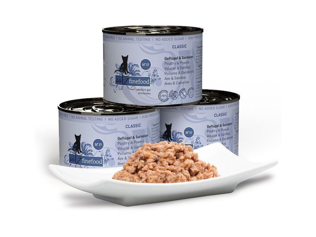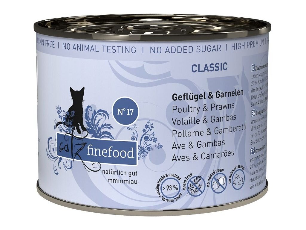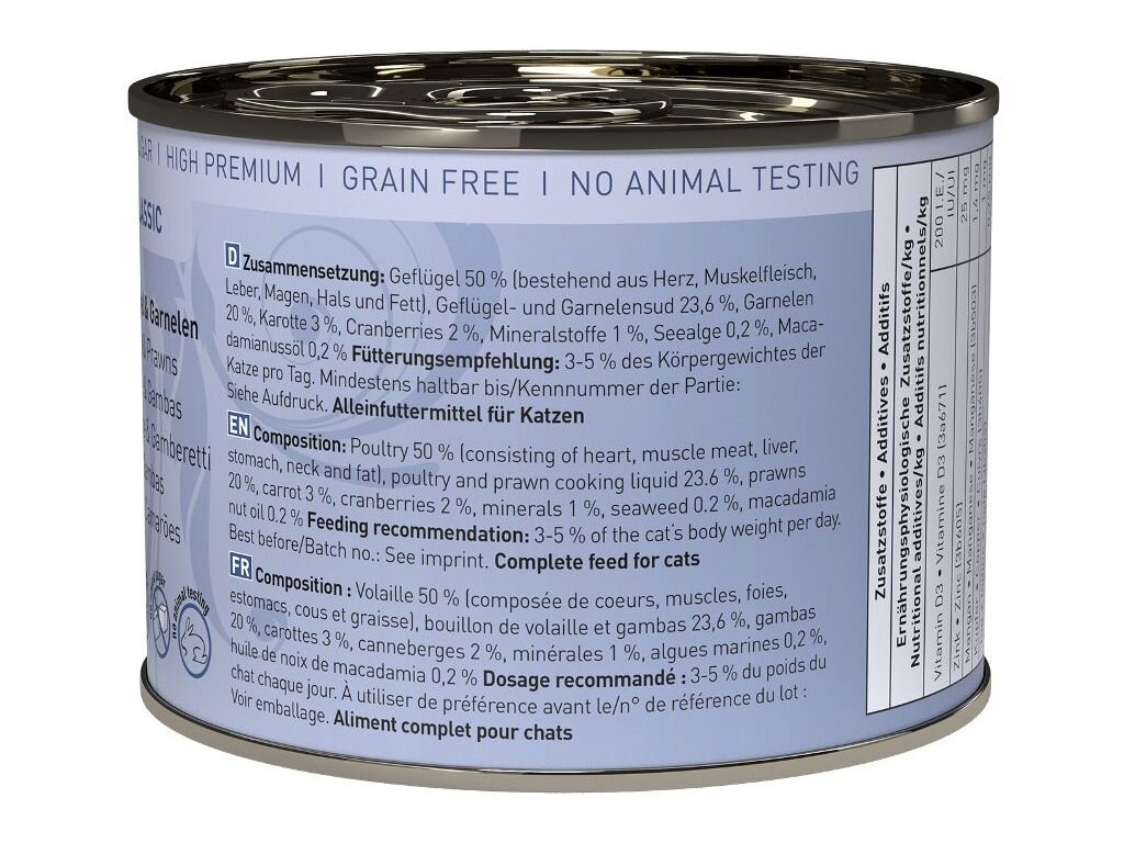 Lahodná konzerva pro kočky, která obsahuje vysoký podíl drůbežího masa a garnátů, zdraví prospěšné brusinky a mořské řasy. Krmiva Catz finefood obsahují pouze suroviny vysoké potravinářské kvality a svým složením odpovídají přirozené kočičí stravě. Jsou bez konzervantů, umělých barviv a dochucovadel. Kapsičky neobsahují geneticky upravené suroviny. Jedná se o kompletní krmivo. Složení: drůbeží maso 50% (srdce, svalovina, játra, žaludek, krk a tuk), vývar z drůbeže a garnátů 23,6%, garnáti 20%, mrkev 3%, brusinky 2%, mořské řasy 0,2%, olej z makadamových ořechů 0,2% Analýza: hrubé bílkoviny 10,2%, hrubé oleje a tuky 5,2%, hrubé popeloviny 2,8%, hrubá vláknina 0,4%, vlhkost 80% Nutriční doplňkové látky na 1 kg: vitamín D3 200 IE, taurin 1500 mg, zinek 25 mg, mangan 1,4 mg, jód 0,75 mg, měď 1 mg