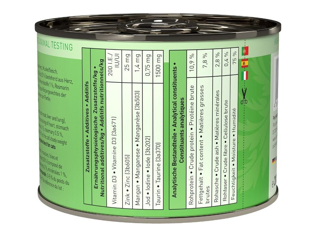 Datum minimální trvanlivosti a číslo šarže najdete na zadní straně obalu. Krmivo skladujte v suchu. Po otevření skladujte v lednici a co nejdříve spotřebujte. Catz finefood – lahodné kapsičky a konzervy pro kočky, kvalitní krmivo vyrobené v Německu! Zodpovědný chov koček začíná už výběrem potravy. Vitalita a zdraví zvířete závisí totiž velkou měrou právě na tom, čím Vaší kočku krmíte. Catz finefood je zdravé a vyvážené krmivo pro kočky. Jednotlivé porce krmiva jsou připravené tak, aby odpovídali přirozené potravě koček – kořisti. Catz finefood spojuje místní charakter jednotlivých regionů s dlouholetou zkušeností a znalostí výroby kočičího krmiva nejvyšší kvality. Všechny suroviny jsou odebírány od prověřených a převážně německých producentů. Při výrobě Catz finefood je kladen velký důraz na transparentnost výrobního procesu. Zásadně bez používání příměsí, barviv a feromonů stejně jako podřadných proteinů. Z tohoto důvodu Catz finefood neobsahuje: - žádný masový separát, - žádnou kostní moučku, - žádné proteinové náhražky jako je sója, - žádné obiloviny, - žádná umělá barviva, - žádné feromony, - žádná umělá aromata, - žádné geneticky upravené suroviny, a žádné konzervační látky. Podle názoru koček je Catz finefood chutné a zdravé! Mňauuu!
