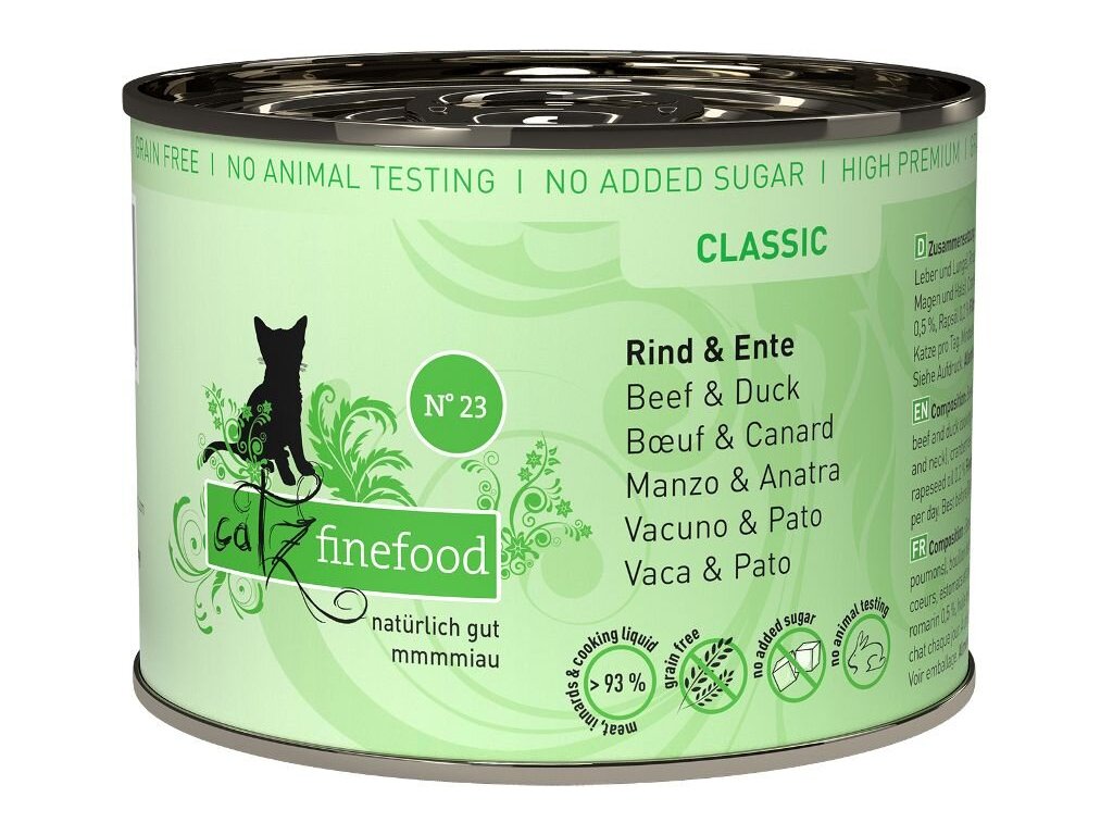 Lahodná konzerva pro kočky, která obsahuje vysoký podíl hovězího a kachního masa, zdraví prospěšné brusinky a aloe vera. Konzervy Catz finefood obsahují pouze suroviny vysoké potravinářské kvality a svým složením odpovídají přirozené kočičí stravě. Jsou bez konzervantů, umělých barviv a dochucovadel. Konzervy neobsahují geneticky upravené suroviny. Jedná se o kompletní krmivo.