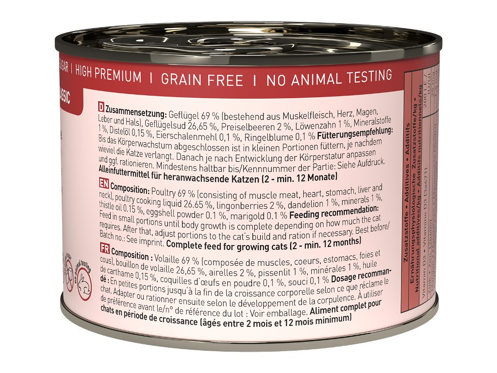 Jedná se o kompletní krmivo s vysokým obsahem masa, obohacené o ovoce, zeleninu, bylinky, vitamíny, minerály, oleje a další zdraví prospěšné přírodní suroviny. Zkrátka ideální složení pro uspokojení výživových potřeb rostoucích koček všech plemen od dvou do dvanácti měsíců.