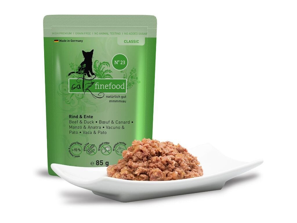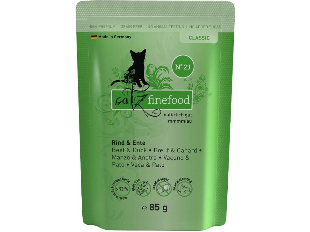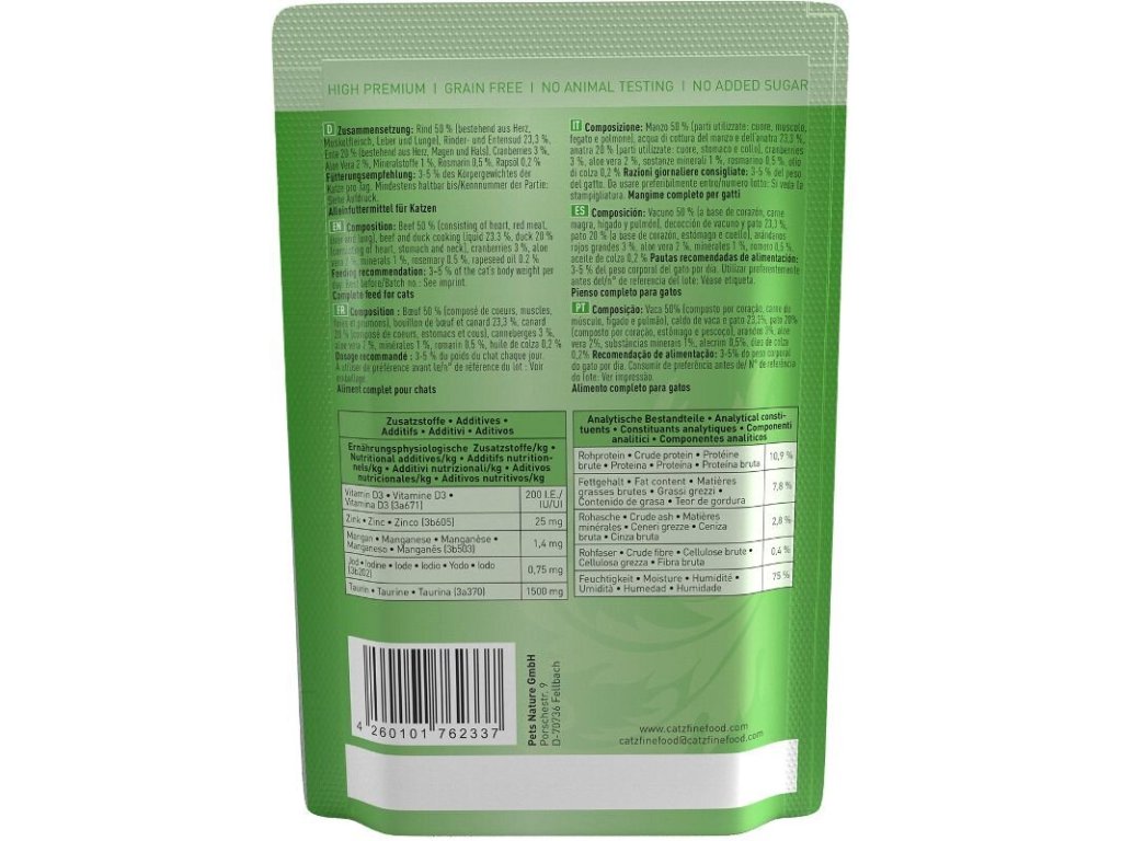 Lahodná kapsička pro kočky, která obsahuje vysoký podíl hovězího a kachního masa, zdraví prospěšné brusinky a aloe vera. Konzervy a kapsičky Catz finefood obsahují pouze suroviny vysoké potravinářské kvality a svým složením odpovídají přirozené kočičí stravě. Jsou bez konzervantů, umělých barviv a dochucovadel a neobsahují geneticky upravené suroviny. Jedná se o kompletní krmivo.