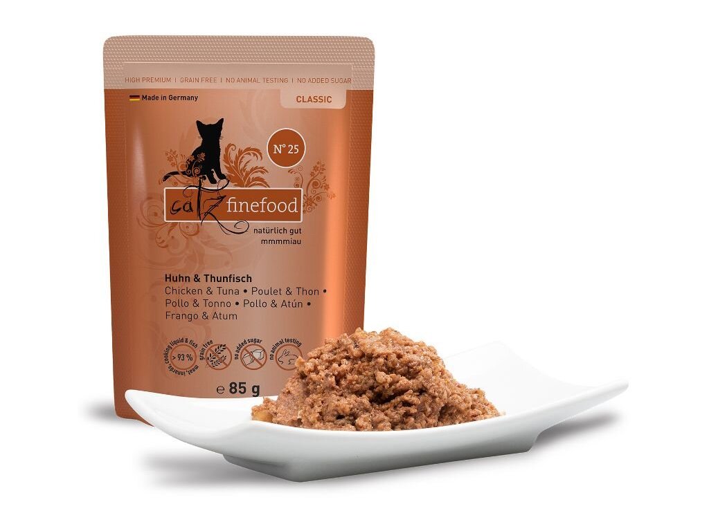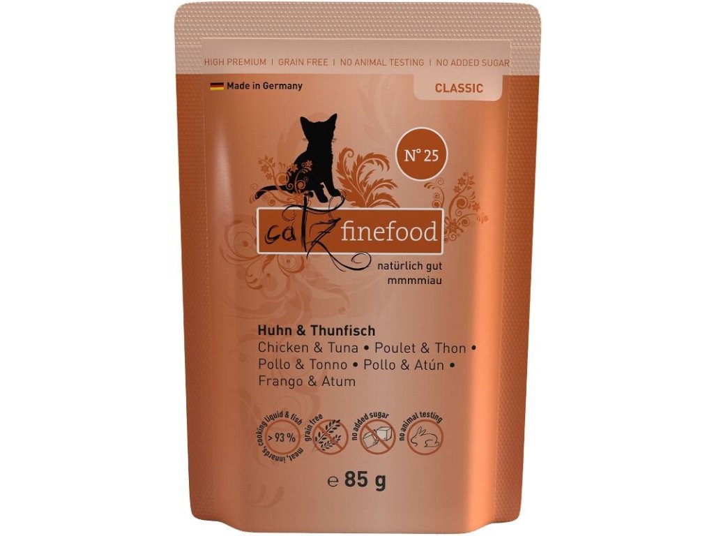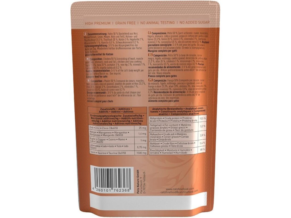 Lahodná kapsička pro kočky, která obsahuje vysoký podíl kuřecího masa a tuňáka, zdraví prospěšné šípky a heřmánek. Kapsičky a konzervy Catz finefood obsahují pouze suroviny vysoké potravinářské kvality a svým složením odpovídají přirozené kočičí stravě. Jsou bez konzervantů, umělých barviv a dochucovadel a neobsahují geneticky upravené suroviny. Jedná se o kompletní krmivo.