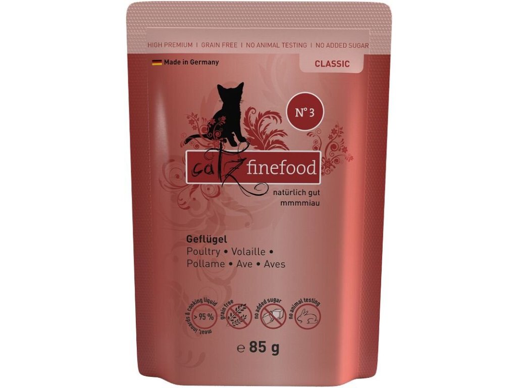Lahodná kapsička pro kočky, která obsahuje vysoký podíl drůbežího masa, zdravé brusinky a smetánku lékařskou. Kapsičky Catz finefood obsahují pouze suroviny vysoké potravinářské kvality a svým složením odpovídají přirozené kočičí stravě. Jsou bez konzervantů, umělých barviv a dochucovadel. Kapsičky neobsahují geneticky upravené suroviny. Jedná se o kompletní krmivo.