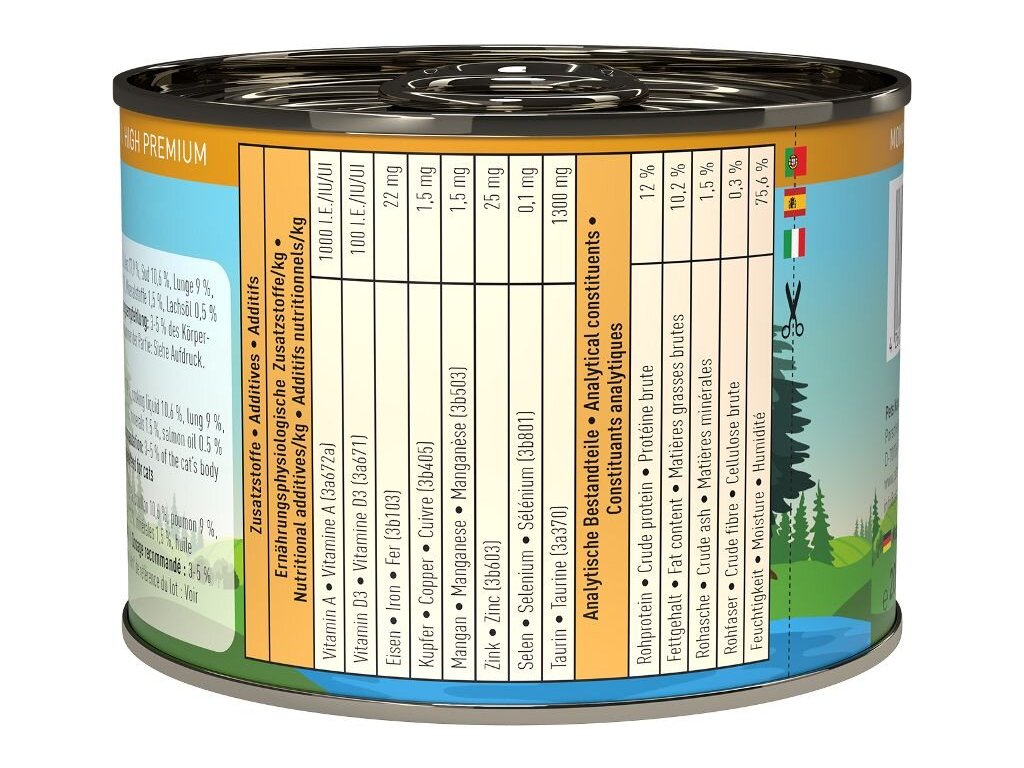 Složení: hovězí 94 % (svalovina 53,6 %, srdce 17,9%, vývar 10,6 %, plíce 9 %, játra 8,9 %), mrkev 2 %, sýr (bez laktózy, bez soli) 2 %, minerální látky 1,5 %, lososový olej 0,5 %
