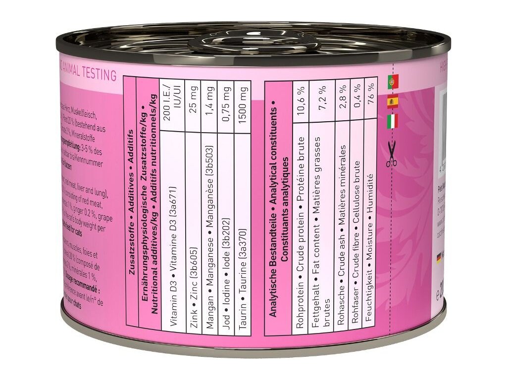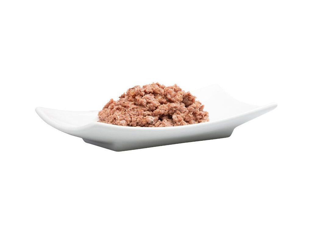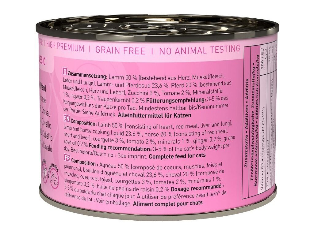 Složení: jehněčí maso 50% (srdce, svalovina, plíce a játra), vývar z jehněčího a koňského masa 23,6%, koňské maso 20% (svalovina, srdce a játra), cuketa 3%, rajčata 2%, minerální látky 1%, zázvor 0,2%, olej z hroznových jader 0,2%