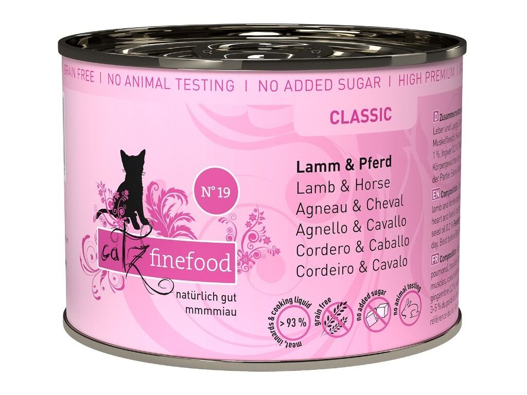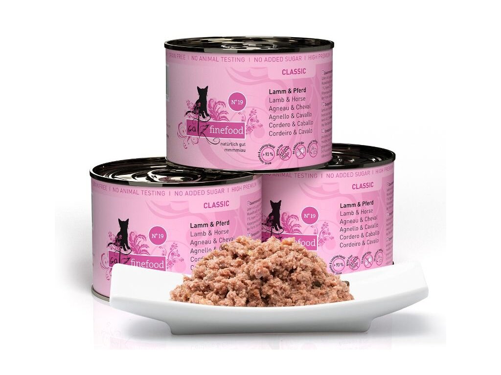 Lahodná konzerva pro kočky, která obsahuje vysoký podíl jehněčího a koňského masa, zdraví prospěšná rajčata a zázvor. Konzervy Catz finefood obsahují pouze suroviny vysoké potravinářské kvality a svým složením odpovídají přirozené kočičí stravě. Jsou bez konzervantů, umělých barviv a dochucovadel. Konzervy neobsahují geneticky upravené suroviny. Jedná se o kompletní krmivo.