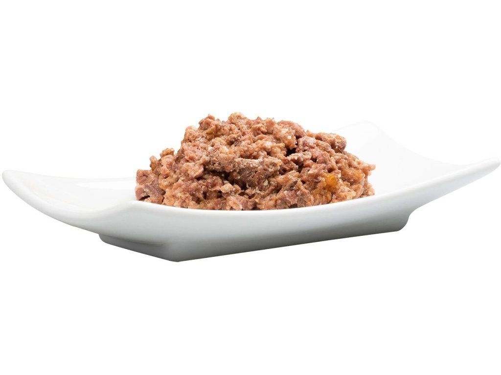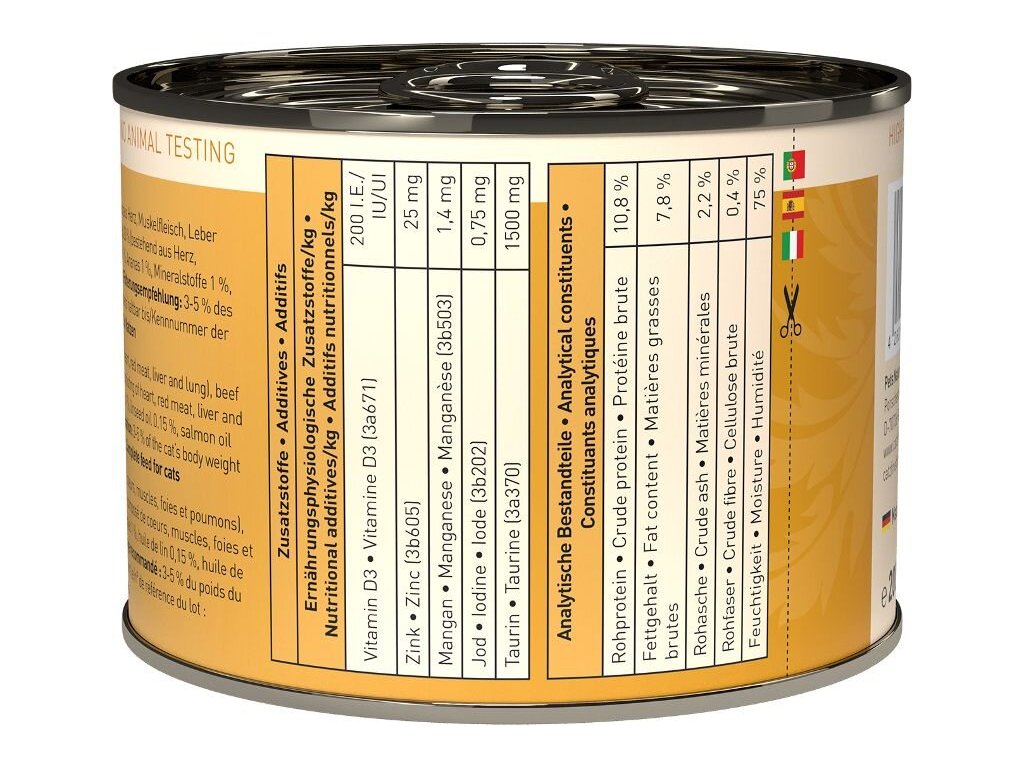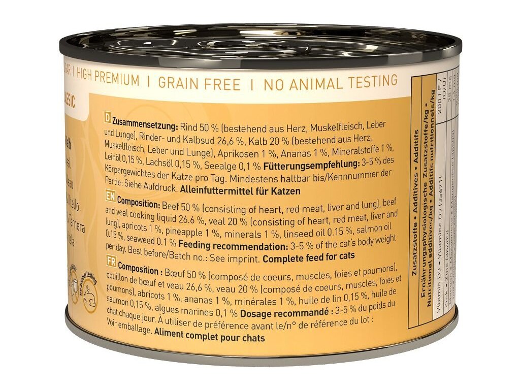 Složení: hovězí maso 50% (srdce, svalovina, játra a plíce), hovězí a telecí vývar 26,6%, telecí maso 20 % (srdce, svalovina, játra a plíce), meruňka 1%, ananas 1%, minerály 1%, lněný olej 0,15%, lososový olej 0,15%, mořská řasa 0,1%