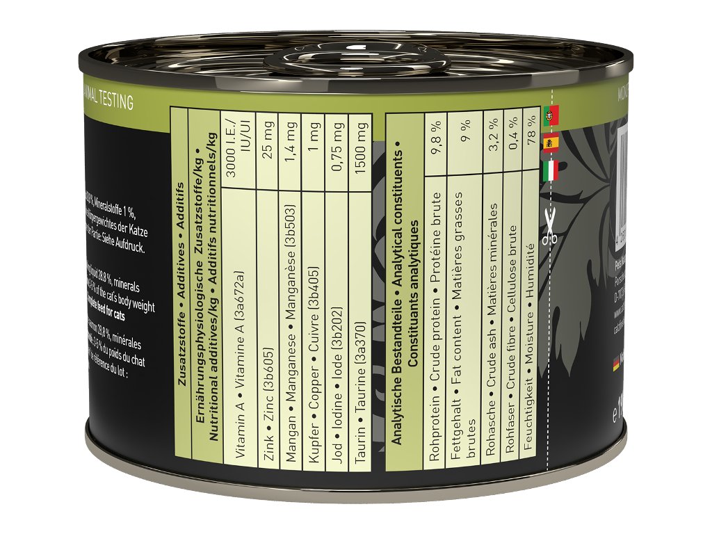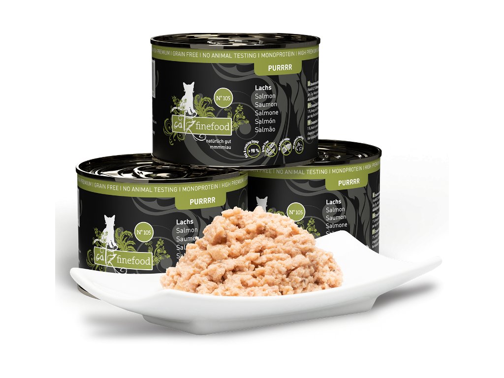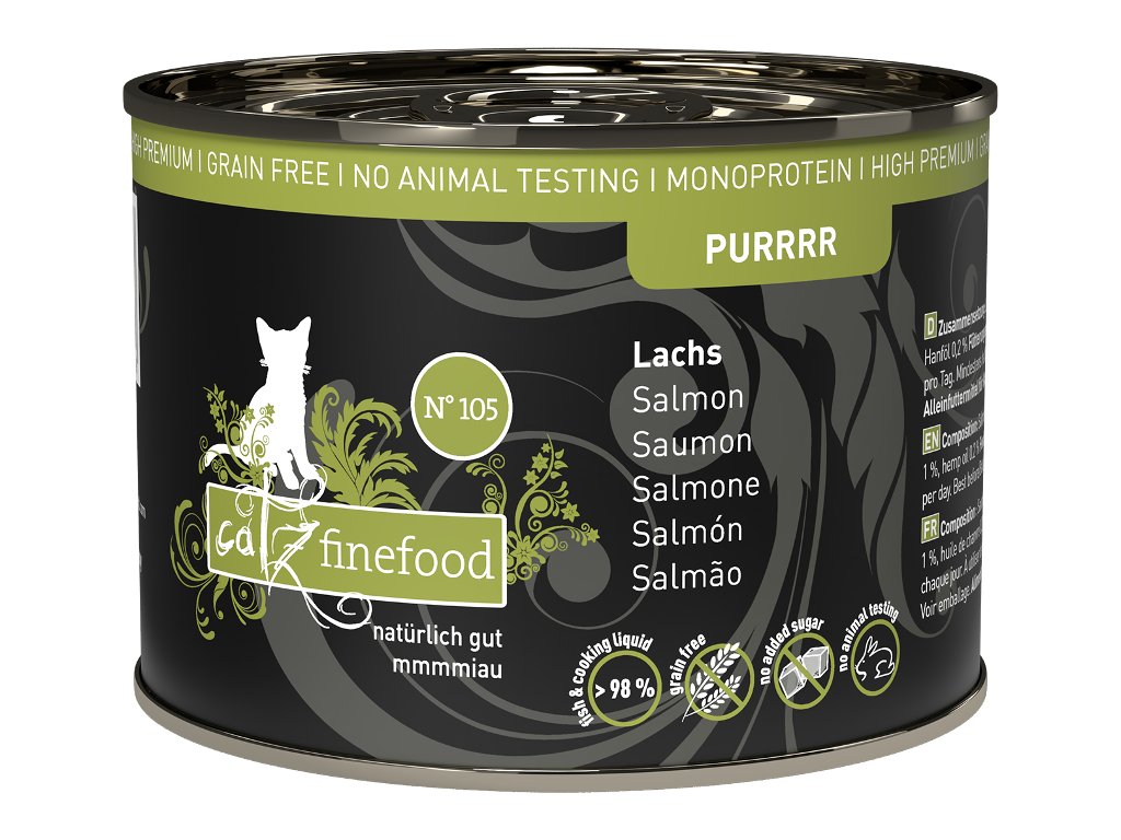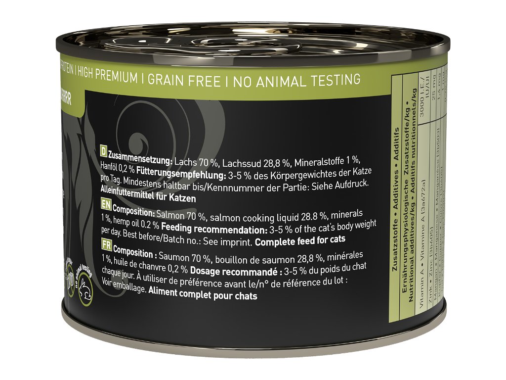 Lahodná konzerva pro kočky, která obsahuje pouze maso z lososa, vývar, minerální látky a konopný olej. Konzerva je vhodná i pro kočky s citlivým zažíváním nebo pro alergické kočky. Jedná se o kompletní krmivo. Suroviny jsou vysoké potravinářské kvality a svým složením odpovídají přirozené kočičí stravě. Jsou bez konzervantů, umělých barviv a dochucovadel. Konzervy neobsahují geneticky upravené suroviny.