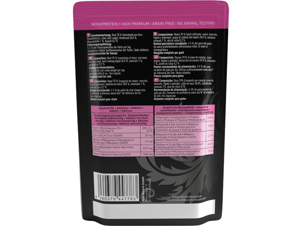 Excelentní kapsička pro kočky, která obsahuje pouze hovězí maso, hovězí vnitřnosti, hovězí vývar, minerální látky a řepkový olej. Je proto vhodná i pro kočky s citlivým zažíváním nebo alergiky. Jedná se o kompletní monoproteinové krmivo pro kočky všech věkových kategorií a plemen.