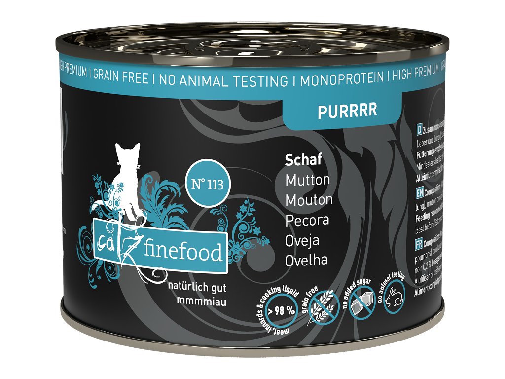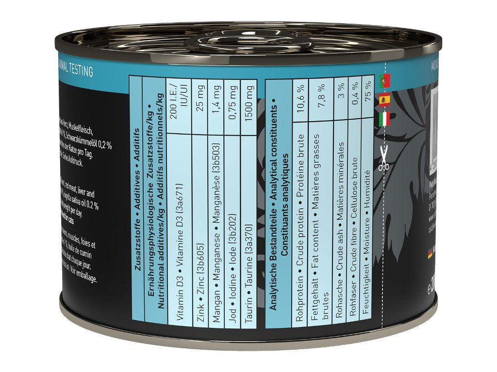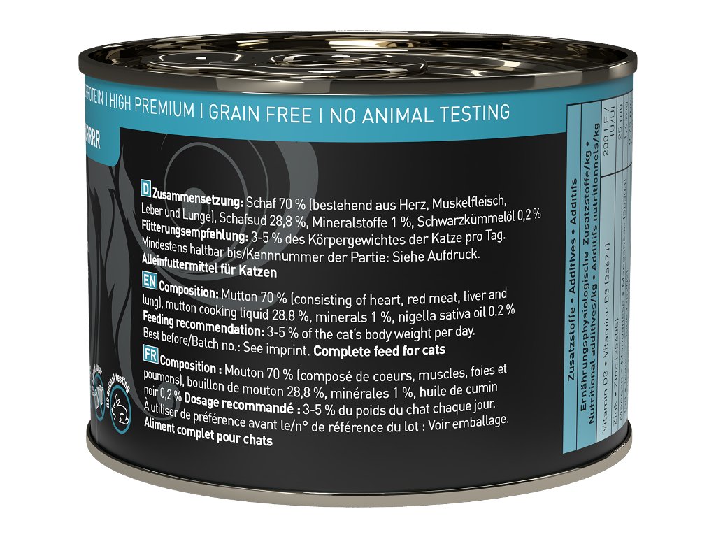 Lahodná konzerva pro kočky, která obsahuje pouze skopové maso, vývar, minerální látky a olej z černuchy seté (černý kmín). Konzerva je tak vhodná i pro kočky s citlivým zažíváním nebo pro alergické kočky. Jedná se o kompletní krmivo. Suroviny jsou vysoké potravinářské kvality a svým složením odpovídají přirozené kočičí stravě. Jsou bez konzervantů, umělých barviv a dochucovadel. Konzervy neobsahují geneticky upravené suroviny.