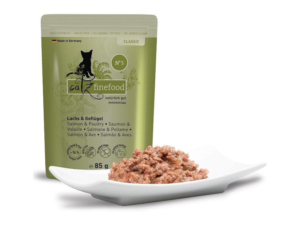Lahodná kapsička pro kočky, která obsahuje vysoký podíl masa z lososa, jemného drůbežího masa, zdravý špenát a rajčata. Kapsičky Catz finefood obsahují pouze suroviny vysoké potravinářské kvality a svým složením odpovídají přirozené kočičí stravě. Jsou bez konzervantů, umělých barviv a dochucovadel. Kapsičky neobsahují geneticky upravené suroviny. Jedná se o kompletní krmivo.