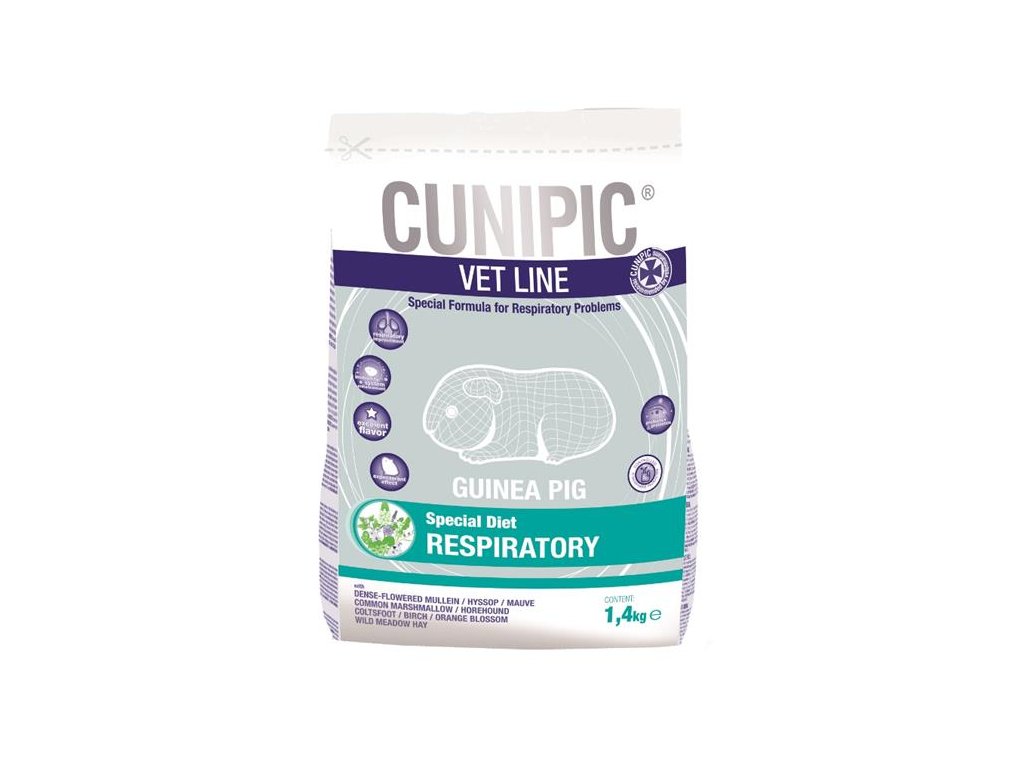 Kompletní vyvážené krmivo pro morčata obsahující divoké luční seno a léčivé rostliny, které pomáhají zlepšit funkce dýchacího systému morčat. Obsažené léčivé byliny mají příznivý vliv na snížení příznaků kašle, zánětů a infekcí dýchacího traktu, zápalu plic, bronchitidy, alergií či astmatu. Receptura Respiratory nemá žádné vedlejší účinky a může být používána dlouhodobě.