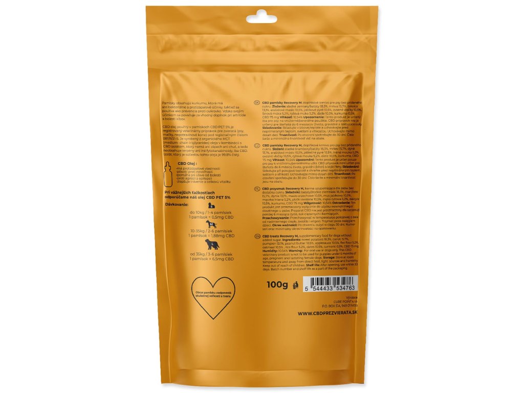 Složení: Sladké brambory/batáty 16,3 %, mrkev 15,7 %, dýně 13,1 %, arašídové máslo 10,5 %, jablečné pyré 10,5 %, ovesné vločky 10,5 %, lněná mouka 5,2 %, rýžová mouka 5,2 %, datle 10,5 %, kurkuma 0,5 %, CBD 100 mg, vitamín E (tokoferol) 2,0 %, benzoan sodný.