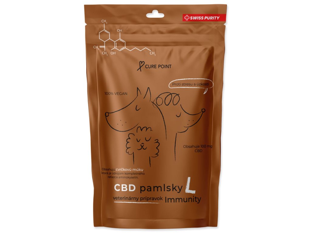 Veterinární a 100% veganské CBD pamlsky vyvinuty pro podporu imunity a vitality psů velkých plemen (nad 35 kg), které mají celou řadu benefitů a vitamínů. Je vhodné je podávat ve stresových situacích jako je např. návštěva veterináře, oslavy Nového roku nebo v případě odloučení od majitele na delší dobu.