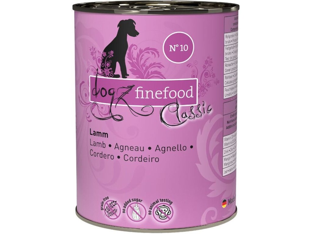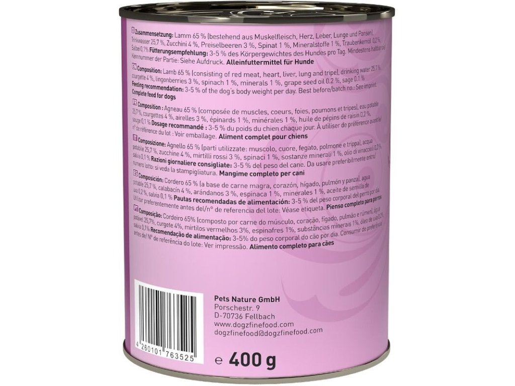 Lahodné krmivo pro psy, které obsahuje vysoký podíl jehněčího masa, zdravé brusinky, cuketu, šalvěj a špenát. Dogz finefood obsahuje pouze suroviny vysoké potravinářské kvality a svým složením odpovídá přirozené psí stravě. Krmivo je bez konzervantů, umělých barviv a dochucovadel. Krmivo neobsahuje geneticky upravené suroviny. Jedná se o kompletní krmivo.