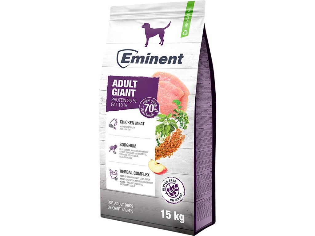 Kompletní krmivo Eminent Adult Giant je určené pro dospělé psy velkých a obřích plemen s hmotností nad 45 kg. Extra velké granule zabraňují hltání a zlepšují trávicí proces. Kousání velkých granulí pomáhá redukovat zubní kámen a udržovat ústní hygienu. Chondroitin s glukosaminem doplněné o mangan posilují klouby a chrupavky pro aktivní psí život bez bolesti. Prebiotika a vitamíny podporují rovnováhu střevní mikroflóry a posilují imunitní systém, zatímco omega mastné kyseliny dodávají lesk srsti a zdraví kůži.