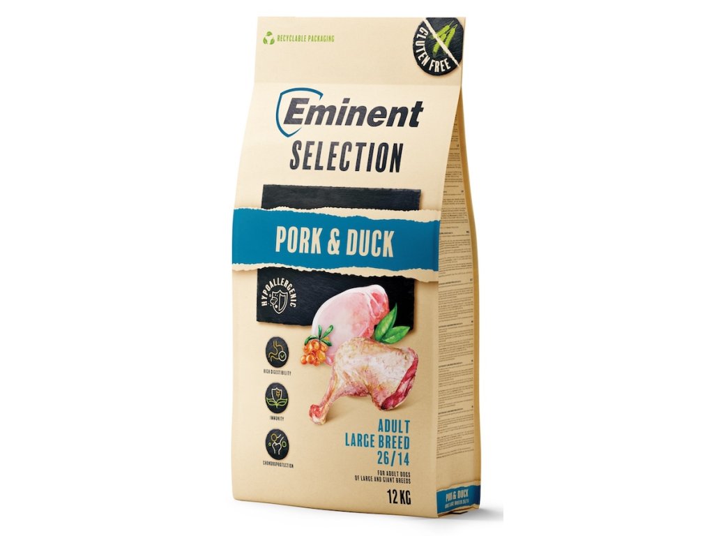 Vysoký obsah kvalitních živočišných bílkovin z vepřového a kachního masa poskytuje širokou škálu aminokyselin, důležitých pro svaly, tkáně a správnou funkci všech orgánů. Díky absenci obilovin se snižuje riziko vzniku alergií, krmivo je snadno stravitelné a je tak ideální i pro dospělé psy s citlivým zažíváním. Granule mají navíc speciálně upravenou velikost a tvar - to pomáhá předcházet hltání a následným trávicím problémům (nadýmání a torzi žaludku). Pro podporu zdravých kloubů obsahuje krmivo chondroprotektiva, která jsou důležitá nejen pro aktivní psy, ale i pro prevenci pohybových problémů v pozdějším věku. Toto krmivo splňuje vysoké nutriční požadavky dospělých psů velkých plemen, podporuje jejich vitalitu, zdraví a aktivní životní styl.
