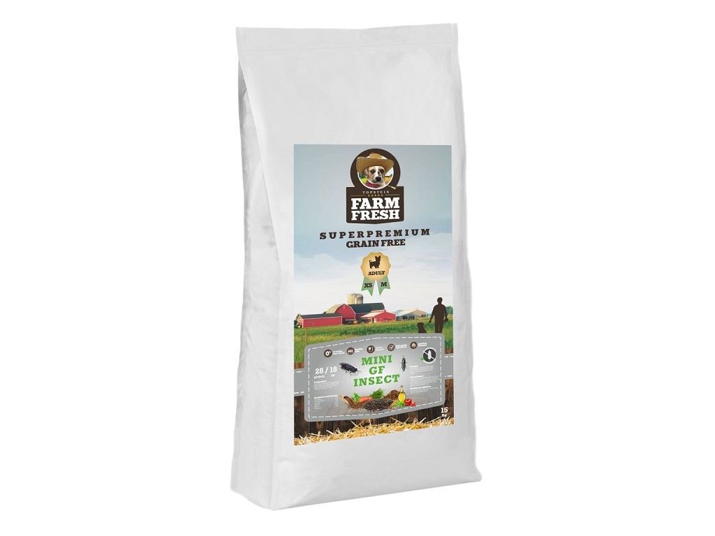 Složení: Sušený hmyz 29%, sušené sladké brambory 19.7%, hrášek 17.5%, kuřecí tuk 10.5%, hrachová bílkovina 8.5%, pivovarské kvasnice 3%, minerály 2%, sušená rajčata 2%, sušená mrkev 1%, lososový olej 0.5%, lněný olej 0.5%, brusinky 0.2%, inulin (zdroj FOS) 0.2%.