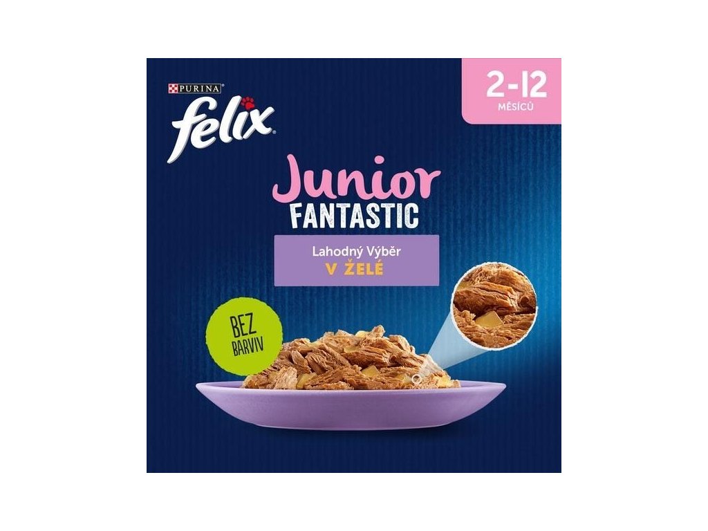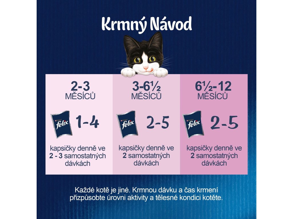 Kapsičky pro koťata Felix obsahují masové kousky s patrnými masovými vlákny, kousky drůbežího masa obklopuje šťavnaté želé. Každá receptura kasiček Felix nabízí nové chuťové možnosti a kombinace ať už včetně zeleniny nebo kapsičky zeleniny prosté. Každá kapsička Felix představuje právě jednu čerstvou krmnou dávku, tedy snídani, oběd a večeři.